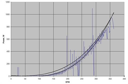 This is the data from my 48V battery system. There is a second parallel setup on the 24V battery, that has the same cubic shape, but is just offset approx 60RPM lower and the power maxes out at approx 50W at about 250RPM.