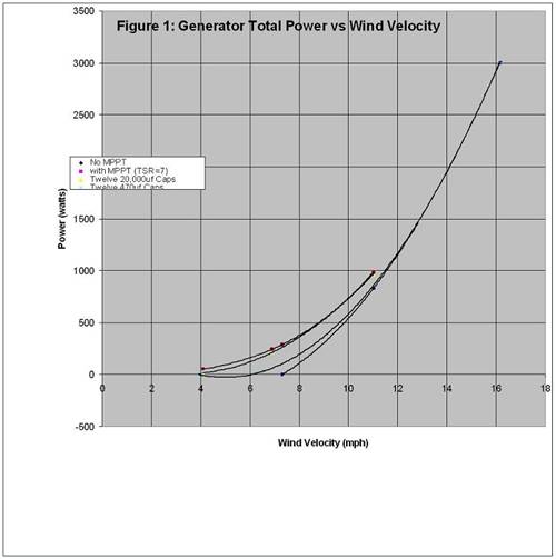 3.Windmill with Capacitor MPPT: Two curves are shown: one with twelve 20,000uf capacitors; the other with twelve 470uf capacitors. Notice that the curve using 20,000uf capacitors comes close to providing the same power versus wind speed as the PWM circuit. The 470uf circuit provides little boost at wind speeds under 6 mph; above 6 mph it provides about 20 to 30% of the power as the PWM circuit.