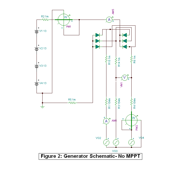 a. The basic generator and rectifier circuitry were modeled using TINA II (free software provided by Texas Instruments). A circuit diagram is provided below including instrumentation. Generated voltage and frequency are an input. Generated power (PM2) is an output.