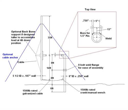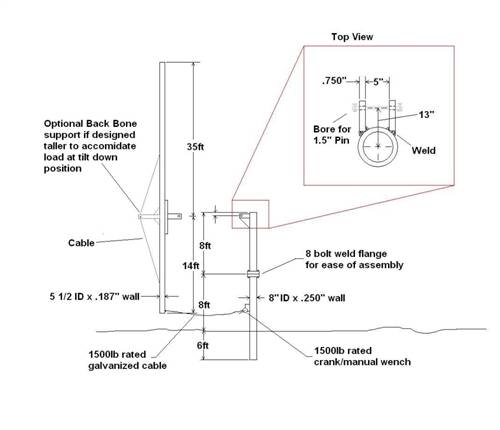 Per my sketch. The lighter sections of the pole handle load at about 16ft above ground were the pivot starts. The lower 16ft section is the heavy 8" dia. So in reality, only 34ft of the lighter 5 1/2dia tubing is carrying the load.