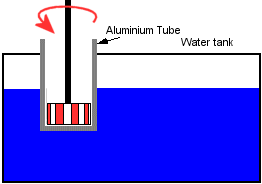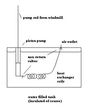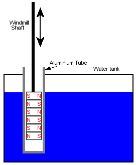 A set of tightly packed alternating magnets are suspended inside a aluminium tube by the windmill drive shaft. The tube is blocked at one end to keep water tight, and mounted into the water tank, as shown. As the windmill dives the magnets up and down, they will generate a bucket load of heat into the aluminium pipe. The faster the windmill, the more heat generated. And there is no starting problem as there is with a compressor, at slow speed the eddy current load will be small, where a compressor may have to push against a back pressure.