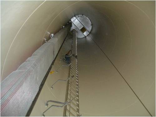 Definitely worth it! 85 meters to the top. Three sections as shown below and 2 more shorter ones. At least you get to rest at each section. It's funny because most of the people I climb with are the site techs and they are young and in shape from climbing every day. One day I smelt this burning smell inside and got scared but it was just the tech stopping and waiting for me and having a smoke on the deck above. Meanwhile I'm panting and on the verge of throwing up something I ate 14 years ago.