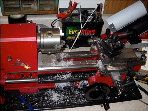 May 19, 2010 Update Okay; here we go: Just to keep things in perspective, this is my lathe and it's run by that 12-volt garden tractor battery sitting to the rear. The reason for all this "smallness" is I plan on retiring in my travel trailer when the time comes (soon!). Here's the back end of a HDPE (high-density polyethylene) plug I am using as a bushing to hold the windmill's shaft. The hole was cut with a letter "O" drill; the shaft is 5/16" steel. This gives a good running fit. Here's the same shot from a different angle. I cut the bushing with an "interference" fit and jammed it into the aluminum tubing. There is a tiny shoulder cut on the front to keep it from traveling under load. This is the FRONT of the windmill's main bearing (bushing). You'll likely note I "faced" the rear and not so in the front. This is so I can test the wearability of the rough HDPE against a thrust bearing. If it smoothes out from wear, I'll just face it off next time. It is just an experiment. Next up will be the main shaft and the hub, which will cary the three Corflute blades (still waiting on the Corflute shipment!). Stay tuned! . . . . . Mac Nothing difficult is ever easy! Perhaps better stated in the words of Morgan Freeman, "Where there is no struggle, there is no progress!" Copeville, Texas |