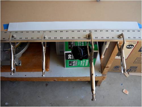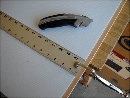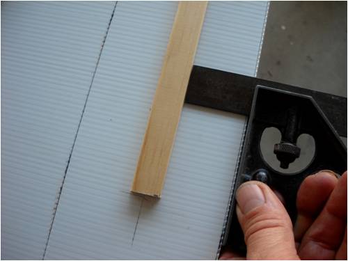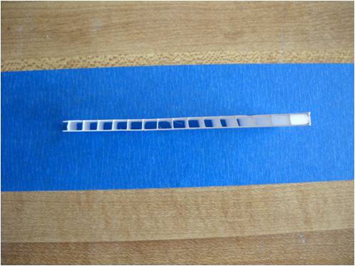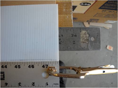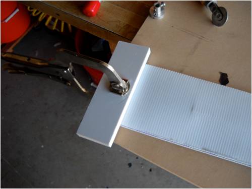 Crew As many of you already know, I make my blades out of a plastic sigh material called Coroflute. In the USA, it's called Cloroplast; same stuff. It's basically the same as corrugated cardboard only it's made from very tough plastic. This is a small piece of the stuff. I'm using the blue tape as a background so you can better see how it's made. Here it is stand on its end. See the little ribs? This is 4mm Coroflute. I use 2mm as do many who build and fly R/C gliders and sail planes. In fact, I'll be building a new plane for myself out of it soon. The plane will feature an 8-foot wing span with one dihedral. The wings will bolt to the welded aluminum fuselage, which will also house the electric motor (for days without thermals), speed control, radio receiver, flight as well as power-assist batteries, servos and anything else I've forgotten. It will use "wingerons" which are merely ailerons (a little flap along the trailing edge of each wing) and a "mixing" radio. With only two servos, it'll go up, down, left, right, roll, etc. Anyway, back to the Coroflute. What I'll do here is post pictures and a running tutorial telling anyone who wants to build their blades the same way I do exactly how I do it. I took pictures all the way through an entire build. For those of you who think these blades are too flimsy, let me set you straight; they're bullet-proof! Each blade consists of a folded and glued single piece of Coroflute sheet and a wood (I used pine since it was lightweight, strong, costs next to nothing and readily available) and some well-placed globs of cyanoacrylate (CA) glue. More on the gluing later. Layout is key here. Once you dab on the CA glue, it's history. You must be accurate in laying out, marking, cutting and gluing. I use a 2' by 4' piece of "MDF" as a cutting and laying-out surface. The Coroflute is held in place using a metal ruler and a vice-grip clamp. This stuff is really slippery, so you have to make sure it's down tight before you draw on, cut or glue it; really important, even crucial step. Accurate measurement means starting in the same place each time. I use a flat surface (carpenter's square here) on one side and I butt both the work and the ruler against the same vertical surface to make sure each is equally places. This shows a sheet of Coroflute cut into a square, which is 8" wide parallel to the plastic ribs and 48" long. It will make two 4" x 24" blades when it's done. The yellow-handled screwdriver is what everyone else uses to crush the coroflute. I do it another (easier!) way: This is what I use. It's the little tool you use to shove the rubber welt into the slot when you re-screen an aluminum window screen. Note it has two ends. We use the rounded end and not the grooved end. This is the end we use and all it's used for is to "crush" one side of the coroflute so it will fold easily along the line. More on that later. Look closely and you'll see a little valley between the two sides of the wheel. This makes two little "knife" surfaces, which will cut the coroflute. We don't want to cut it, just mash it. Use the other end! Really, really, really important: The fold is made so that the ribs of the Coroflute are running front to back. That is, leading edge to trailing edge. This makes for built-in "ribs" as well as adds to the strength of the blade (or wing). The wood spar takes up the load along the length of each blade preventing it from bending under load. So when you're cutting things out, remember which way the ribs are running and don't cut things out the wrong way! Basic Rule: If it folds really easily, you've goofed; start over! Sorry, them's the rules. Note here that there is a metal ruler on EACH side of the coroflute. I did this to show that there needs to be a large flat surface on the back side of the fold or you'll "crinkle" the fold and that's not part of the plan! Here's what I use instead. It's a plastic drywall applicator (less than $1 @ Home Depot). It spreads the bending force over more surface area than if you were to use merely your hands. The next few pictures show how to lay things out prior to making the folds. Pay strict attention that your work is always clamped to the work table. If it slips, you start over; it's that simple. No room for errors with this stuff! This is an end-view of a locking clamp securing the work to the table. There is a metal ruler on top of the coroflute, then the plastic sheet, then the work table and the clamp sandwiches it all and holds everyone's place. This shows a sheet of creased coroflute plastic just prior to its being folded. I've begun the fold and am using a roll of blue tape to hold up the handle on the plastic drywall knife so I can take a picture of the whole shebang. This shows a flat piece of wall-trim board clamping a 4-foot blade section. Here's where we're headed; a nearly-perfect symmetrical-section blade! Even though you may think you were born with calibrated eye balls, always use the proper tool to mark your cuts. This shows how to mark where a blade spar will be cut. The blades are 24" long and the spar is the same length, but 4" of the spar sticks out at the "root" end of the blade. This gives us something to attach it to the windmill hub as well as makes it easier to glue-shut and trim the blade tips (more later on). This shows laying-out and positioning of the blade spar. It is centered and is 24" long, but sticks out the root 4" and is 4" shy of the outboard end (tip) of the blade. Glue it in place using clamps before you fold the other side over and glue it in place. Here's a little trick I use to make sure the spar is parallel to the edge. I set my square to the exact measurement, then use it to check the other end. Don't glue things until you've placed them and marked them with a pencil while they are clamped in position. Doing this, all you then have to do is dribble the glue down the marked out area and use the same lines to place the spar, then clamp it down. If you're in 