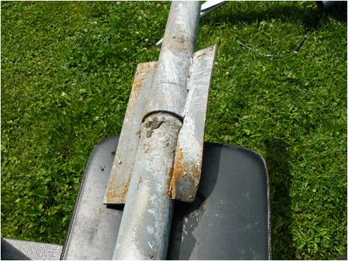 Thanks guys for your comments and concerns. Gordon Yes, this is the F&P modeled after yours. I think you have it right, run away mill. Karl Thanks for the heads up about Phills hardware. She will fly again I can promise you that. To all. After much thought and some investigation work this is what I believe happened. The mill ran away with the very high winds, the brakes just weren’t strong enough to keep it at safe RPM. The blades spinning at God only knows RPM bowed enough to smack the mast. I would like to believe that she would have survived the heavy winds if not for blade contact. The photo with the mast on the bench (9th photo from the top) showing where I made an earlier splint repair of the coupling shows the contact area. You can see the (right)metal splint is bent at the bottom right and the entire area has the white markings of PVC. The last photo shows the cut in the solid aluminum rod where she hit the metal splint. I do believe that the energy released from the hit was absorbed by the lower mast mount area and she came down. I am happy to say that the alternator, hub plate, rod mounts and yaw came out in good condition. I got lucky with the tail still intact. One cannot proceed with repairs and up grades if one does not know what went wrong. 1. First and foremost up grade braking to a system that will, with out a doubt stop it no matter what. 2. Lack of clearance blades to mast. 3. Underestimated the amount of blade flex. 4. The mill, and mast should have NEVER came down regardless of winds or blade contact, mast up grades are in order. I know I can have her up and flying again soon but until I get a firm grip on a full stop mode she will stay on the ground, hummm that could take awhile.