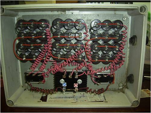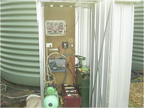 The next photo's are of the Battery shed it houses the Invertor,logger,Voltage doubler oww and the batterys, all two sets of them. I have one set of the Trojon 105's (love them) and four Excide 875 amp/hr. I also have a PL40 to control the solar pannels on the roof. The invertor is a Latronics 1800watt 24 volt