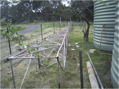 Here is the tower that the turbine is going on. It's about 45 ft from base to top of frame. Youu may be able to see the pipe that runs up the middle, this can be raised another 40 ft. I have also posted a photo of my battery shed and the gear I have got running so far. Tomorrow I will have re-connected the logger with a few extras.