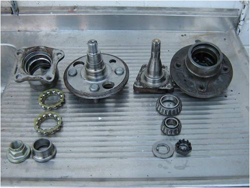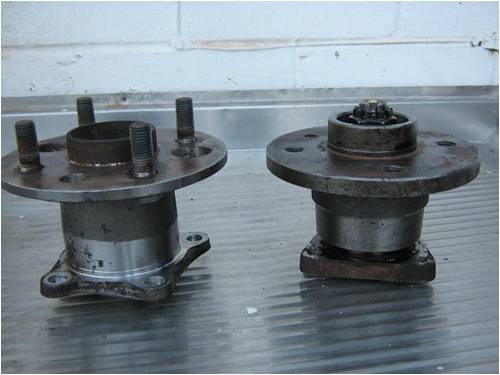 The one on the left is from a Toyota and the one on the right is from a Holden. They are the rear hub assemblies from a front wheel drive car. Many that I pulled apart have the rear brake drum as the bearing mount with the stub axle through it, no good for this application and far to much unneeded weight. I decide to use the Toyota hub as it has ball bearing races and the Holden hub has taper bearings. Also I figure Toyota is world wide and would be easier to find for most, but either would work well and both had their own advantages to design.