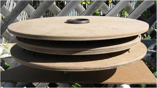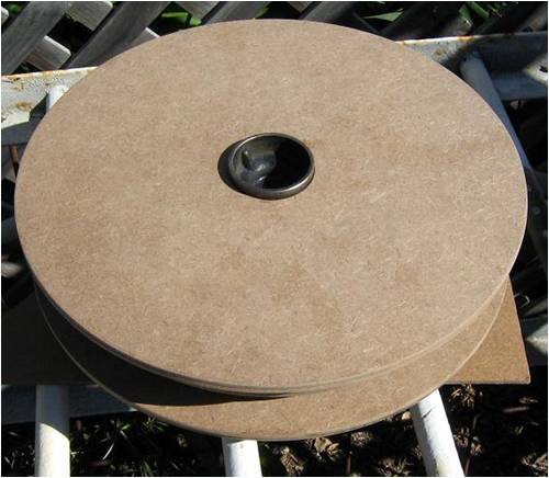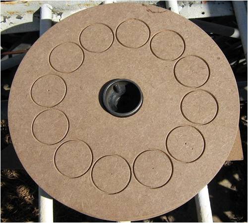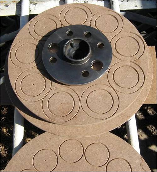 The next step was to workout how and where the magnet plates would locate and the stator size, so I could see what room I had to fit the coils into, and where the magnets would be located on the plates with what clearance everything had and needed. I had some sheets of Masonite and decided to cut some templates out and stack a few layers to get an approximate size for things. A circle cutter attachment on a hand held router made this a quick easy job. I then marked out the locations of the magnets and coils, placed the masonite discs in the cnc router and engraved the outlines for the coils and magnets. I am not that good a drawing in CAD on the computer, so this was my way of doing the physical lay up and it allows me to see exactly what fits where. Here is a magnet plate.