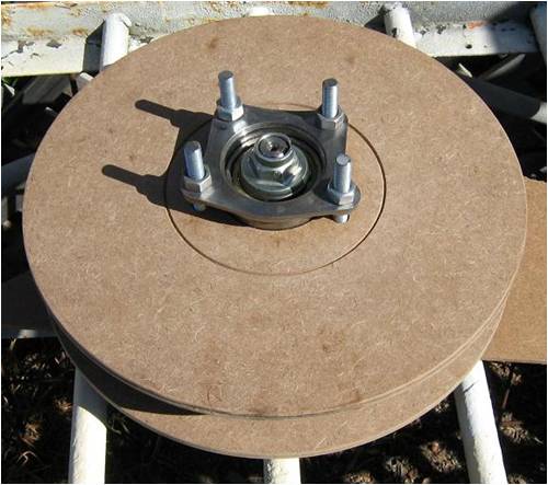 Pete’s wooden mill I recently started to give some serious thought to how I would construct a AXFX mill. I don’t have a lathe and tend to find solutions around this limitation and try to not to need putting jobs out for machine work if I can avoid it. My plan was to build a enclosed 12 inch generator along the lines of Gordon and Phill plus many others have also built. As always a base design gets changed to suit what equipment we have to work with and the materials we can source at a reasonable price. I had a trailer stub axle to use but in planning this posed a problem with mounting to get every thing true in alignment. I then had a thought it would be so much easier to have the whole hub assembly made as a single module and just bolt it in. Hmmm! I had a theory that this has already been widely done, so armed with a kit of tools it was off to a local car wreckers that allows the public to remove the parts they want and just pay for the parts when you leave. After 1-2 hours of disassembling many wheel hub assemblies I finally found what I was looking for….a bolt in windmill part for $13.00 that was made for the job…perfect!!