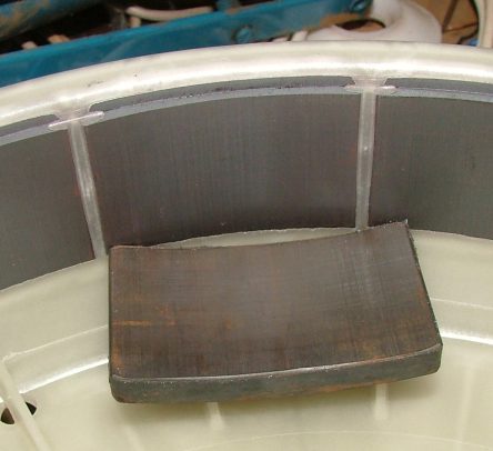 And this is the difference in magnets. A magnet ( actually 4 magnets in one ceramic tile ) from an old hub is shown for comparison. You see the new ceramic tiles are shorter, and contain 3 magnets.