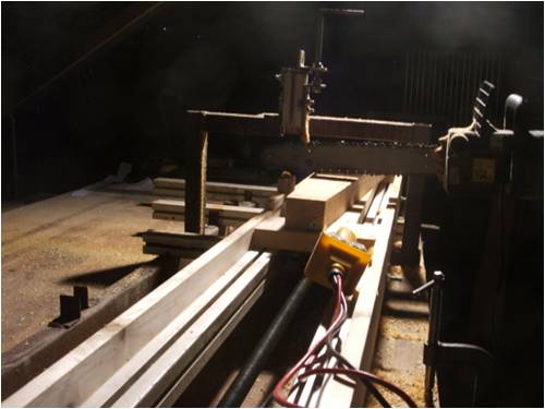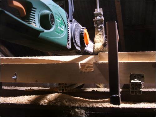 the jig is changed a bit (not much) from the one oztules used ,so the saw is set up to crosscut (or mill out) the wood....the blank is on a moving table run off a windscreen wiper motor , even though its a little electric saw its surprisingly accurate and clean when you get the drop angles and guide cut lines right ..(kind of chop 5mm and go)