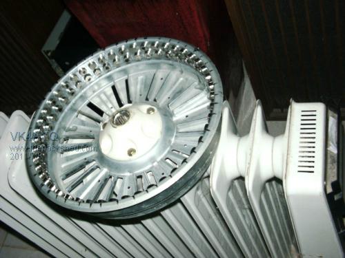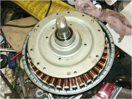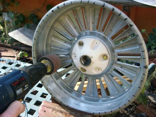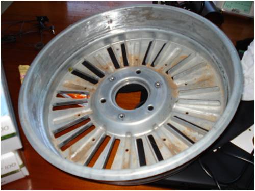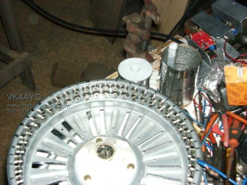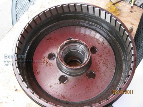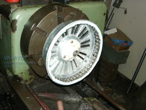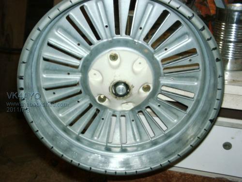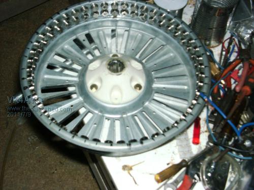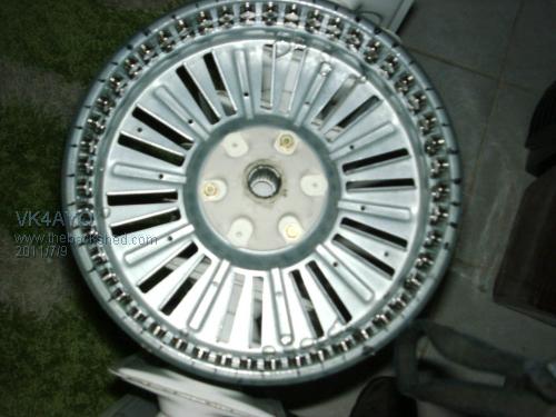 Yeah,, see this is getting interesting.. A pic of the stripped rotor . I usually use those wall tile spacers (bathroom,etc) to evenly space the magnets while attaching them to the roughed up surface of the steel. then , cover the inside surface of the magnets with cloth re-inforced gaffa tape. Then mix the polyester resin and gently pour the spaces between the magnets with the resin ,OH, remove the tile spacers first,lol. Have fun,,, Bruce Bushboy |