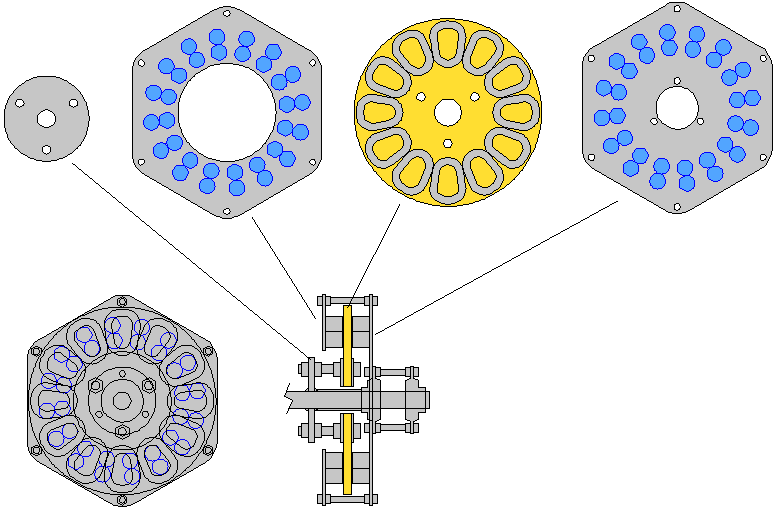 I've been drawing up plans for a small axial flux alternator. I was inspired by recent posts about the price rises in rare earth magnets, and Hugh's comments in this thread about the advantages of ceramics compared to the more powerfull rare earth magnets. My last axial flux build was based on the 50mm wide 12mm thick rare earth magnets. Its unfinished, cause it weighs a tonne and I've got nothing big enough to drive it, it can wait till I get some land and can put up a big turbine. Here's the thread about that build. I searched the magnet suppliers to see what was available in ceramic, and found this little ferrite magnet, its 22mm diameter, 25mm high, 1800 gauss, and $1.10 each. Of all the ferrites, its one of the strongest for its price, due to its long length. So I've ordered 64 of them for the planned axial flux alternator. I'll use two magnets side by side to give a 44mm by 22mm wide magnet pole. As the magnet is narrow, I can fit more magnets and coils around the diameter. Instead of the usual 12 magnets per side / 9 coils layout, I'm using 16(32) magnets per side, 12 coils. More magnets/coils means a higher AC frequency, so more power than a lower magnet/coil count. Plus 4 coils per phase means its easier to wire a stator for 12/24/48 volt operation. While I dont expect anywhere near the power of rare earth magnets, I can see some advantages to using this layout. The magnets are very cheap for their power. 1800gauss for $1.10 in ferrite, the same size magnet in rare earth is 5780 gauss, about 3.2 times stronger, but is worth $22, 20 times the price. Since we are using a weaker magnet, we can use thinner magnet plates, 4 or 5mm instead of 10mm, saving more money and weight. Its also a lot cheaper to get 5mm plate cut than 10mm plate. So by using ferrites we end up with a alternator about 1/4 to 1/3 the power of its rare earth equivalent, for something like 1/10th the price. We also have reduced the weight, and have a alternator that will run cooler and should be more reliable. Plus ferrites dont rust. This is a basic layout, its using the same design as the bigger axial I was building. Diameter is about 260mm. Using two pillow bearings instead of the wheel bearing, the 25mm shaft is fixed.