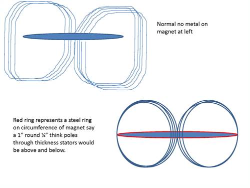 example with ring around circumfrence (red ring ) field line pulled in against the side of the magnet, but stil free space up and down, this is a question about how the lines would react with just a ring. The idea is still for airgap but dual stators one below and one above the rotor. excuse the bad drwaing.