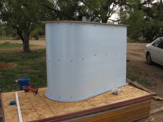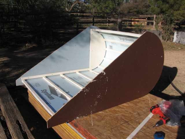 I looked at many different materials wanting something common and hopefully cheap. I ended up with something that fit but in its current form is temporary. (1/2"x4'x8') 1.27 x 122 x 244 cm blue foam insulation board by Dow. It bends around to make my front curve half of a 76.2 cm (30")circle. I do not think I could have made it bend around any smaller curve. Broke the first one while trying to make it bend. It was supposed to fit perfectly with the it taking (8')244 cm to go around the curve and make the flat side of the wing. It didn't as the foam is 1.27 cm (1/2in)thick and the outside stretched so it ended up being several cm too long. My finished diameter of 76.2 needed an inside diameter of 73.66 and that was what the foam board saw.