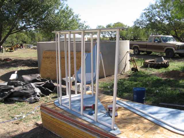 This big a wing I have had to add at least one cross brace and it may need more. It needs more screws and I added a piece on both ends of the foam to secure the ends. It has painted osb winglets and plywood half circles. I still don't have it worked out on the best way to mount it on a tower even in its short test form. Should I run a shaft up the middle to tie the tops to or would just angle braces from the middle work. I hate to spend too much time but would hate to have it throw these wings off. The test tower is 335.28 cm (11') with the turbine on top it will be 457.2 cm tall (15'). A tiltup tower is on the drawing board with a geared speed increaser of 6.5-1 (final drive off old JD combine)