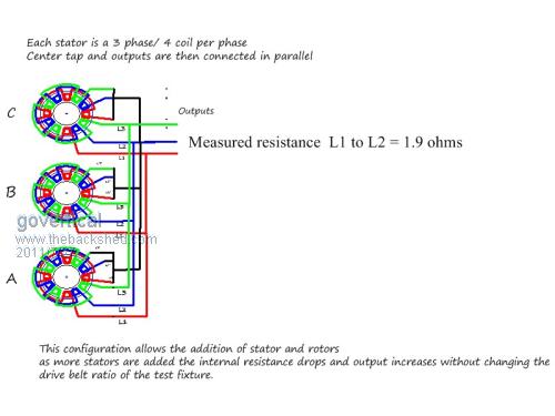 govertical; HI, Quite a machine you have here, The following is not meant to discourage you from completing your project , Some times a new look, a different slant on a thing will show a hidden detail. You have made a larger alternator from 3 smaller ones, with coil phases in parallel you have created an alt. with bigger magnets(flux value) and larger wire (6 in hand) @ one hundred turns,