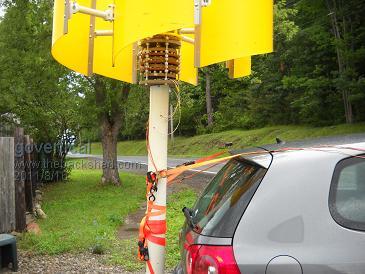 Road test with skid marks Result of today’s road test. Using TV antenna hardware was not a good idea, the mast bent at 65 MPH and the turbine hit the road and was dragged a short distance. I was testing the 6 blade configuration without gear box. The deceased blade angle did improve RPM’s, cut in at 35 MPH. Results indicate that PMA needs larger magnets, thinner stator coils and larger blades to drive gear box. PMA appears unharmed but I am still assessing the damage. Enjoy the day.