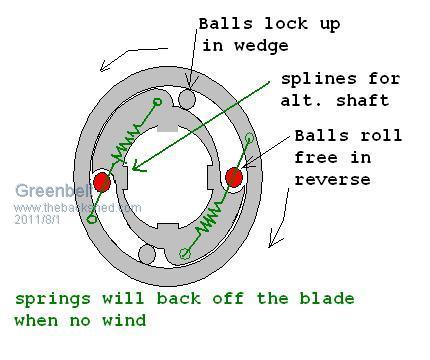 Most of you are familiar with an over run clutch. a device that is built like a Roller bearing with an oval race. the rollers are forced to climb an inclined plane by the outside portion of the clutch which would be connected to the turbine blade,
