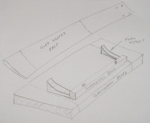 Using stick-on foam or rubber strips, build up two blocks that exceed the width of the blade. Cut them into a wedge shape as shown in the sketch. No need to be overly fussy with exact shape and make thicker than needed as they will clamped. Stick them to the GladWrapped board, butting them snugly against the stick.