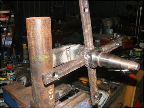 I cut the extra off the 45mm square butt on the stub and I have some 40mm solid square bar here so I'm going to cut a length and set it up @ 45 degrees to give me more tower clearance. I cut 4 off 25x10mm lengths of flat bar for the stator mounts and tapped M16 holes in them for the stator. I will be using M16 grade 8 all thread for holding the stator which should hole the stator in place when the brakes are applied. Under my bench was a 355 mm OD MDF disk so I marked out the pcd then bolted all 4 struts then welded them onto the stub. This ensured that all the holes were lined up and each strut was welded nice and square.