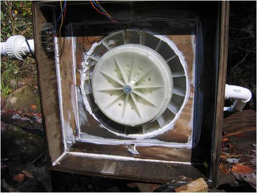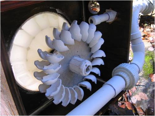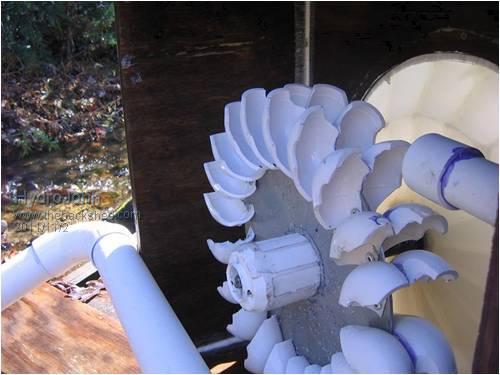 Home made pelton wheel. The nozzle is 3/4" hole drilled in a 1" PVC cap. I used 1" PVC elbows for cups and 1/8" aluminum (salvaged from old highway sign)for wheel. Aluminum wheel is 10" dia and total outside dia is 13 1/4". I'm sure a pelton wheel from EcoInnovation would be much more efficient.