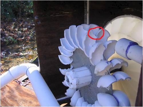 Another photo of pelton wheel. The cups are glued together and attached to the wheel with rivets.