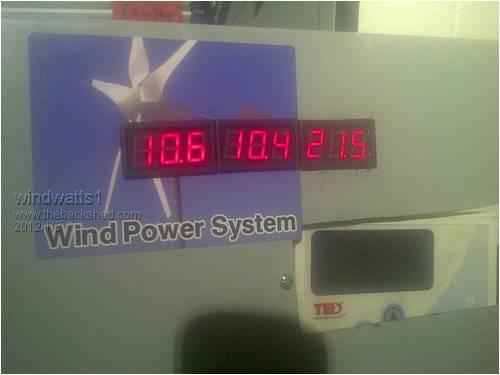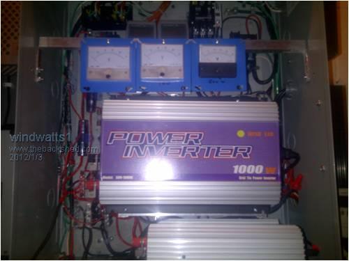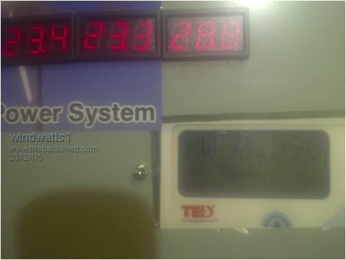 Here is a pic of my system with digital volt meters and a TED energy unit to measure he AC watts comming in. This was last week (12-29-11), 990w, made 3kw that day (24hrs). Not much but all in fun of course. I am looking to get about 2,100w again if he winds would agree.