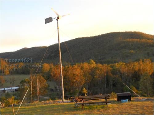 I was thinking of putting a latching 3 phase contactor between the wind turbine and the rectifier to short the alternator at full charge. It sounds like a "diversion" controller is the go. I didn't know there was such a thing. I have played a little by momentarily zapping 12v across one of the phases during a light breeze and if the conditions are right, (and I pick the right phase), the prop will rotate enough to start and then keep running until the breeze drops off again. That's what makes me think about a controller, ie arduino, connected to a wind speed input device that can shove a few seconds of 3phase motor drive up the line when the conditions are right. Something I might play with if I get time. Mean while, I took a couple of shot this evening to decorate this post with as I kow how much I like to see pickies. The size of the tail is another concern of mine. It was sized according to Hugh Piggot's book but I see most of you guy's have much smaller tails. He who dies with the most toys, wins! |