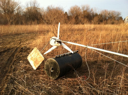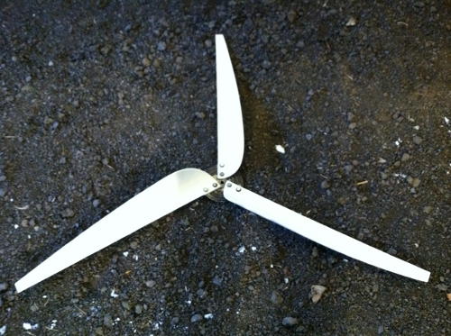 I was scared to get close to it and I rounded up some wire and a weight and attached it to the wire and when we got a slight break in the wind I was able to through it over the remaining blades and hub and was able to stop it. ''