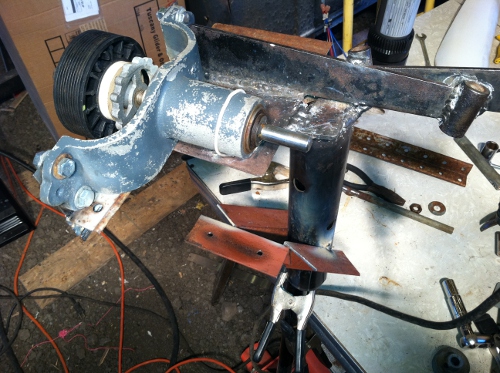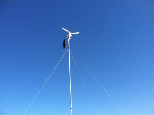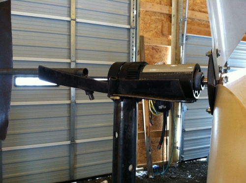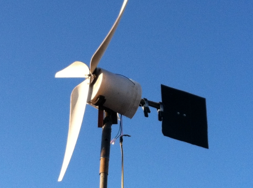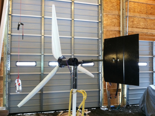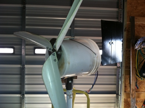 I am currently making the base for the 30 foot tower. Hopefully, the town does not get after me about the windmill & the height. Here is the progress so far. I managed to test the 5 foot windmill on a 14 foot tower (for my other windmill) and noticed a furling problem right away. The tail seems to be too light for the job. I added an old window weight (clipped on) and that seemed to keep it towards the wind better.