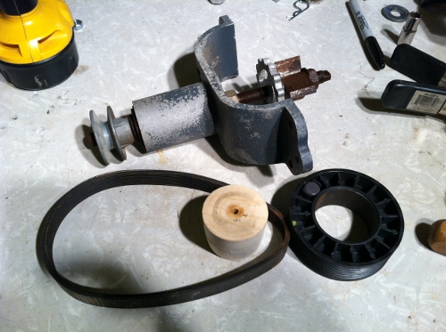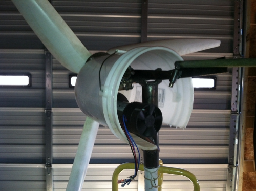 I think I finally got it. I used the belt to make the motor spin faster. I tested it and received about 20 volts in the wind. I think I managed to almost triple the output. With the drill (no blades), I was able to get 60 volts. Until I think of a different cover, I will use a plastic bucket to keep it out of the rain & sun. Next thing will be a tower. Here are some pics from the weekend.