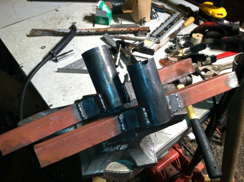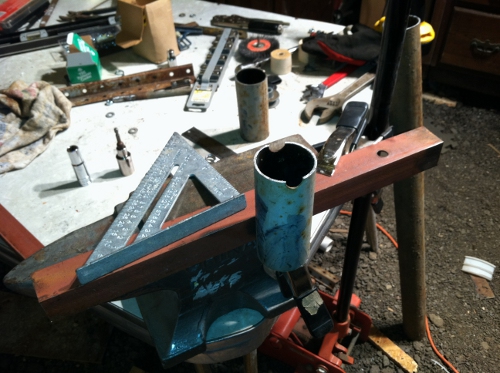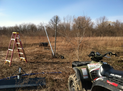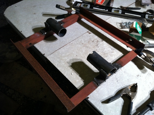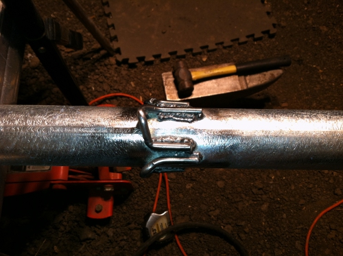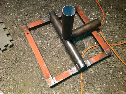 I got the tower base all welded up. As far as the guy wires, I welded strap buckles (to hold plywood together) onto the poles. Since the tower will be 30 feet, I welded the first set of four 27 feet high and the second set of four at 13.5 feet high. Also, I created some strange looking anchors (4 stakes screwed together). They worked on my other tower, so I decided to try it again.
