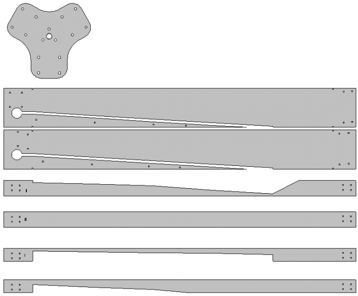 Lastly the first two elongated pieces go top and bottom over the work piece when the blade twist has already been shaped. The two big holes you see allow you to drill a hole through the timber so you can insert the blade of a jig saw and cut out the blade. The two elongated pieces include some notches either end indicating where the blade ends should be cut.