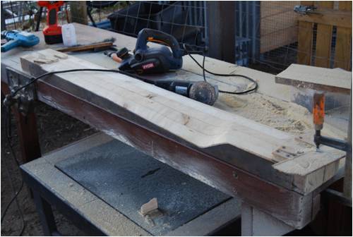 I then take eleongated pieces five and six. I screw these to each side of the timber then shape the bottom profile of the blade.