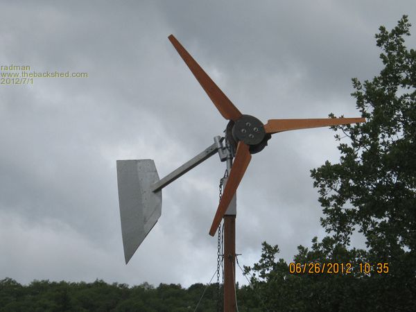 Hey folks here's an update on my 24 volt turbine, I moved it to a better location as for catching wind. It's a lot less convenient as far as wiring goes. But here it has a better chance of catching a breeze. When I took it down for the move, I found my problem, the three wire's going down the pipe had somehow got hung up and were cut up pretty bad, hence the short. The blades spin up with no problem now. It makes 10-11 volts in a lite breeze but I have not seen it go up to the 28 volts I need to charge the battery's. In a afternoon wind, I see 14 to 19 volts so the question is can I run the battery's is series for 12 volts without screwing anything up? The blades are 38". If I ran longer blades could I get more RPM at these lower wind speeds? The pitch of these blades is 15 degrees, would more pitch give me more speed? I think I have worked out a slick way to build these blades which I will share in another post. I didn't take the time to make pictures of the process, but I will work on that in the near future. Radman |