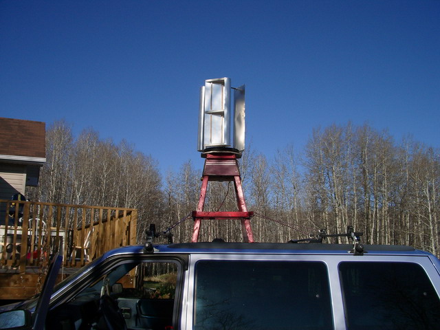 Hi Greg Here is a pic of mine and has a stall problem at startup, once it gets spinning its okay. Might have to change the dia bigger or smaller. don't know yet. There is a generator at bottom anf didn't really get nothing out until 15mph, not good. Thats why wanted to try F&P. I looked like a mad man going down the highway, bikers almost went into the ditch. Look a wind powered Van. Wayne ![]() |