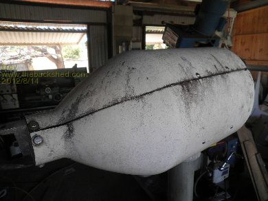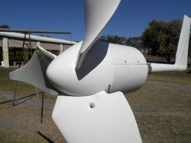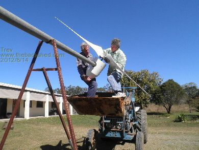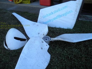 Then it was time to get the old White Pointer 2.5 F&P down. It is the first one ever built, back when the business was called Foundry and Fibreglass. It was a little dirty, had some fungus growing on it. So after stripping it, it was washed and polished. Love your work Marcy. Dad helped too. Some minor repairs also made. The leading edge of the blades were chipped. They were filled and sanded off. Some places on the blades and tail had seperated, only minor stuff, nothing serious. Dad did all the repairs, while I was off teaching. I love teaching, but sometimes I do miss the time in the shed.