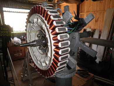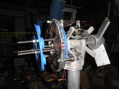 After assembly, tested one coil, 4vac at approx 60rpm. Approx 120rpm was 7.5-8vac. Then wired 2 coils in series which doubled the voltage. Wired all coils up, 3 phase, 2 coils in series, star. Rectified and tested, approx 190-200rpm at 50vdc, which should be something near the cut in rpm.