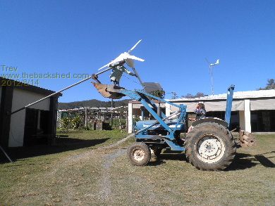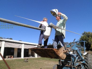 Then dismantle for assembly on the pole and raising in the air. Marcy brings the parts as needed and passes them up. Then drives the loader for me. Driving is no big deal, she grew up on this farm. A light breeze blowing produced a couple of amps up to 5A. At 5A the original AXFX cut in and did a few amps. So the little beauty is a bit in front of the original one. It will be interesting to see how they compare in higher wind.