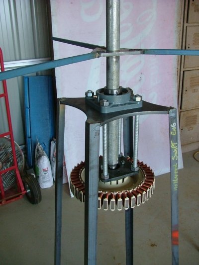 Thats similar to my idea i had... Just a question though. How do you support it up the top? Do you run a 2nd bearing support up the top then go around the VAWT back to your stand? |