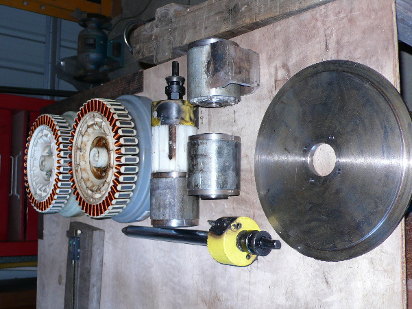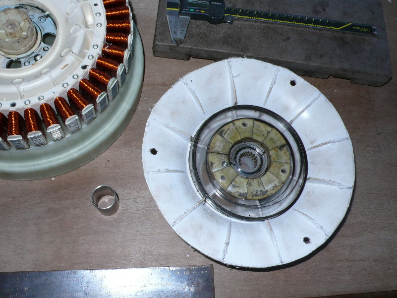 The tools that i have made to easily make dual stator wind gens using as much of the F&P as i can . Saw bores out bearing hub to press fit into 3 1/2" water pipe , then face seal side identical to stator side , bore out spline to fit shaft all using a drill to drive the tools.