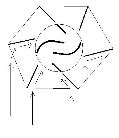Edit: Ooops! topmost sail/vane is back-to-front. If you've ever done any sailing you'll immediately understand the terms and aerodynamic profiles. In basic theory this should produce torque for most of the 360deg. In reality there are considerations of relative wind flow as well as changing flow through the turbine itself. Still I feel a turbine with an adaptive flexible profile such as this will cope with these without the need for the DIY experimenter to have a degree in aerodynamics and a wind tunnel. And before you say it, I agree, All those working parts are a minus. But any comments on the principal idea? was working fine... til the smoke got out. Cheers Gill _Cairns, FNQ |