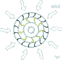thanks for the info, megawhatman, gizmo and gill. that pdf looks like the same image i was tring to show in my first post, it looks like the hawt has less turbulent issues but not needing to follow the wind is a great advantage for the vawt. hmm... puting a tail on it wont help, the only way is to protect the other side from the wind or possably incorparating a vain that will twist to be parralell with the oncoming wind and open up to capture the wind, any think added will surely increase its inertia though.i thought of a folding blade like a folding piece of paper, once facing the wind it will blow open but once 180 degreea around it will close up i am going to start a unit in the new year, a series of centraly hinged blades opening to capture the wind and closing to bypass the incoming drag.