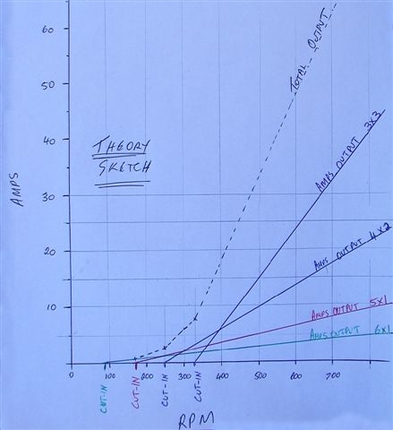 By the way Gill your graphs would show a flaterning off as this point is approached 200 ampturns is my experiance ie if 80 series has 60 turns per coil max current any series connectin 200/60 = 3.3amps in glens case The 6 branch would stop 3.3 amps then 5 branch would start adding its 3.3 amps as mill speeds up then thnext branch 2// would add 6.6 then 3// would 9.9 amps atotal possible output 19.8 amps.