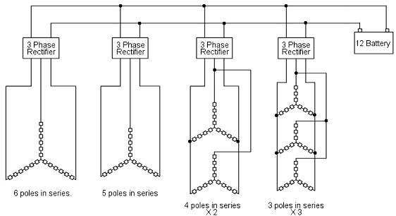 The outputs of the four brigde rectifiers are all connected in parallel. In light winds only the 6 and possibly the 5 pole groups are generating enough voltage to provide a charging current, as the wind picks up the other groups come online as their voltages rise.