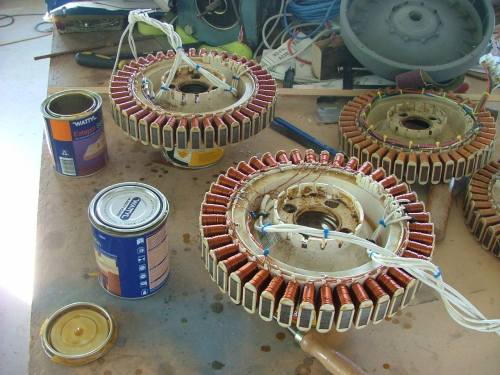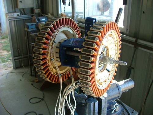 Finished the dual stator windmill this weekend. I re-wired the two stators in a staggered configuration as discussed in this thread http://www.thebackshed.com/windmill/forum1/forum_posts.asp?T ID=749&TPN=1, then gave them a good coating of clear varnish to protect against the weather. The stators are not decogged, and its a 3 phase arrangement, but I was pretty sure the large turbine would overcome the cogging.