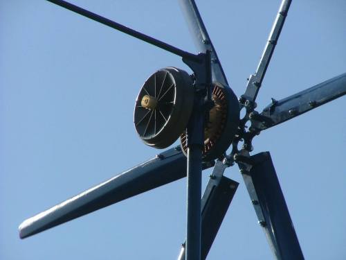 And lastly the finished windmill was put up on the mast. I used my new 6 blade turbine ( see http://www.thebackshed.com/windmill/forum1/f orum_posts.asp?TID=744&PN=1 ), this has been driving a single stator for the last week and made more power than the stator could handle, a few times I saw the power peak at 8 amps but the turbine continued to speed up, the stator was a 7 phase 3 pole 60 series wire, so was working pretty hard.