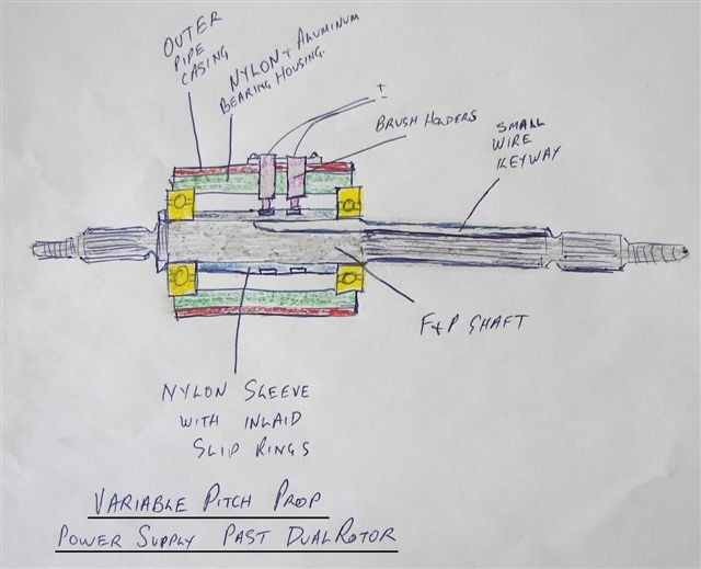 The prop hub mounted motor is still the best option for dual rotor mills yet we still have the problem of getting power to it past the rotor. A hole down the shaft doesn't help as we end up on the wrong side of the rear rotor and no better off. I just can't see a way of supplying power to the prop of a dual rotor mill.
